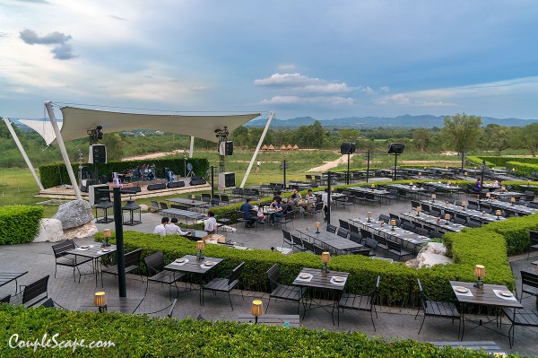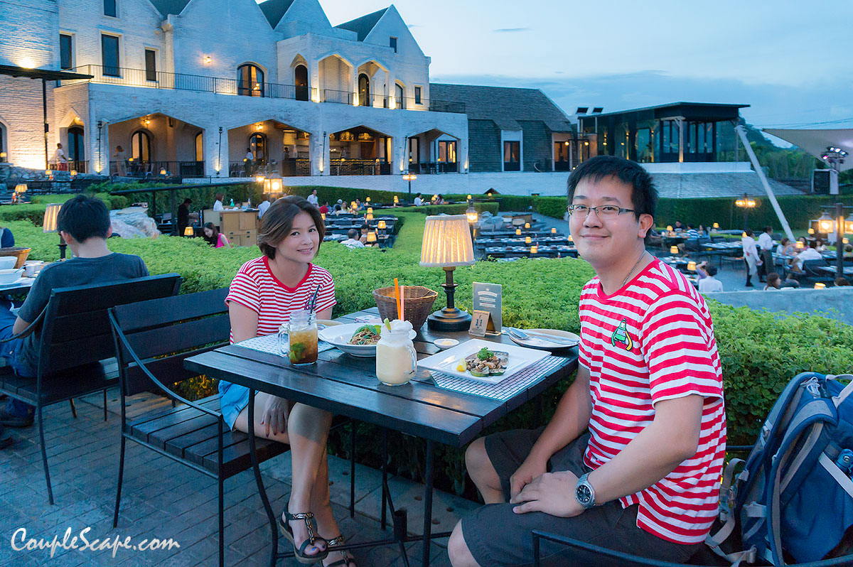 พนักงานถามว่าจะนั่งด้านในหรือด้านนอก เราสองคนก็มองออกไปที่ประตูเห็นมีโต๊ะที่ระเบียงก็คิดว่ามีอยู่ไม่กี่โต๊ะ เลยบอกว่าจะนั่งด้านใน แต่พนักงานบอกว่าเดินไปดูด้านนอกก่อนค่อยตัดสินใจก็ได้นะ เลยลองเดินออกไปดู เจอกับภาพนี้